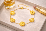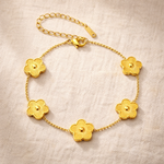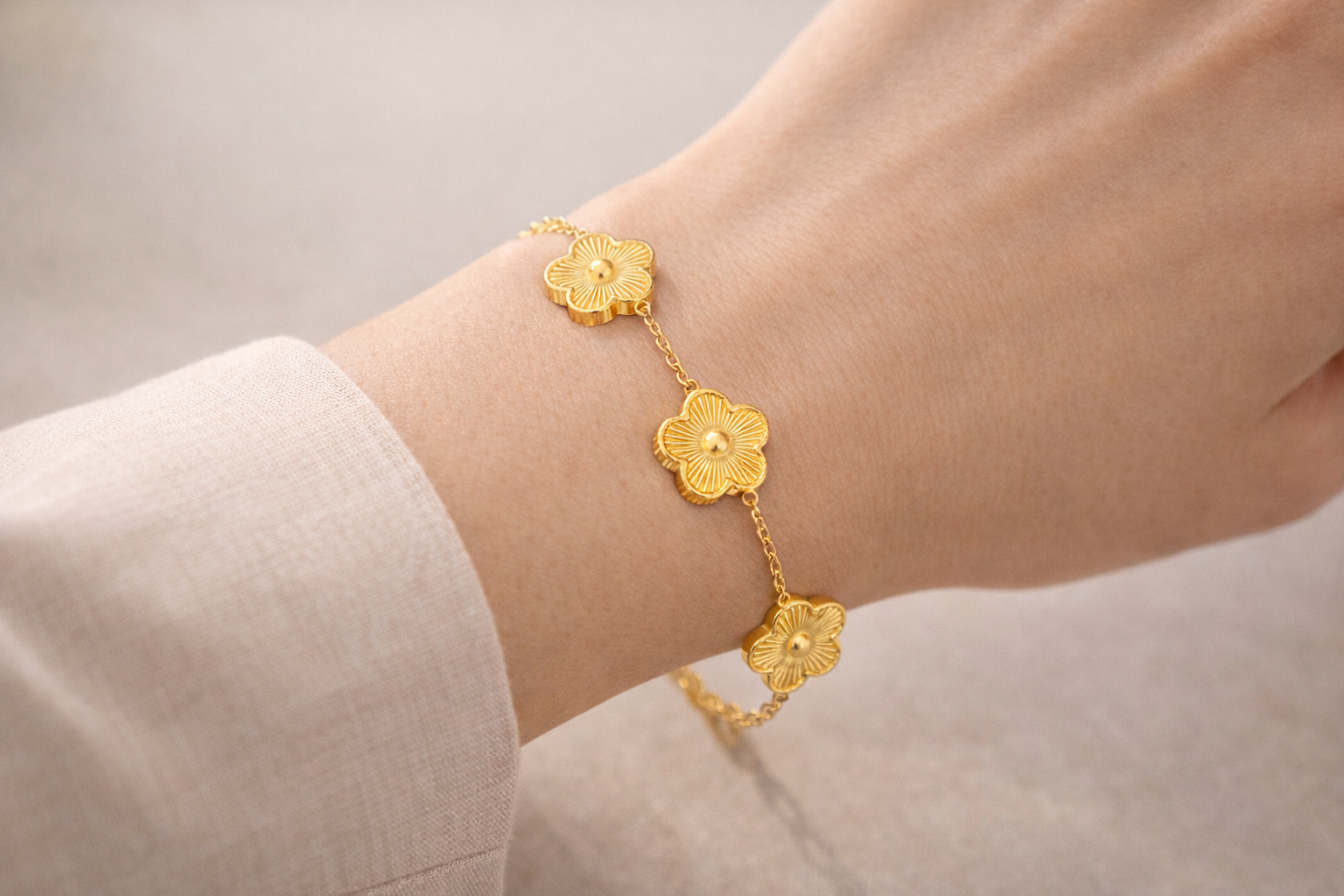 The Florette Gold Bracelet is a bold floral statement designed to stand out. Featuring five engraved flower links with radiant detailing, this piece adds structured shine and texture to your wrist. Slightly thicker and more defined than delicate styles, it’s made for stacking or wearing solo when you want your jewelry to speak for itself.