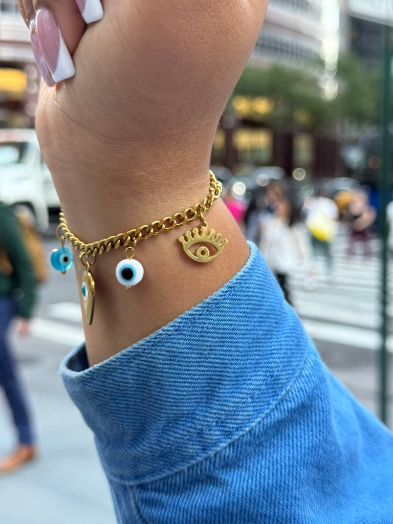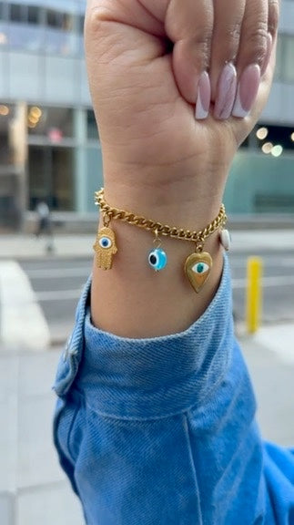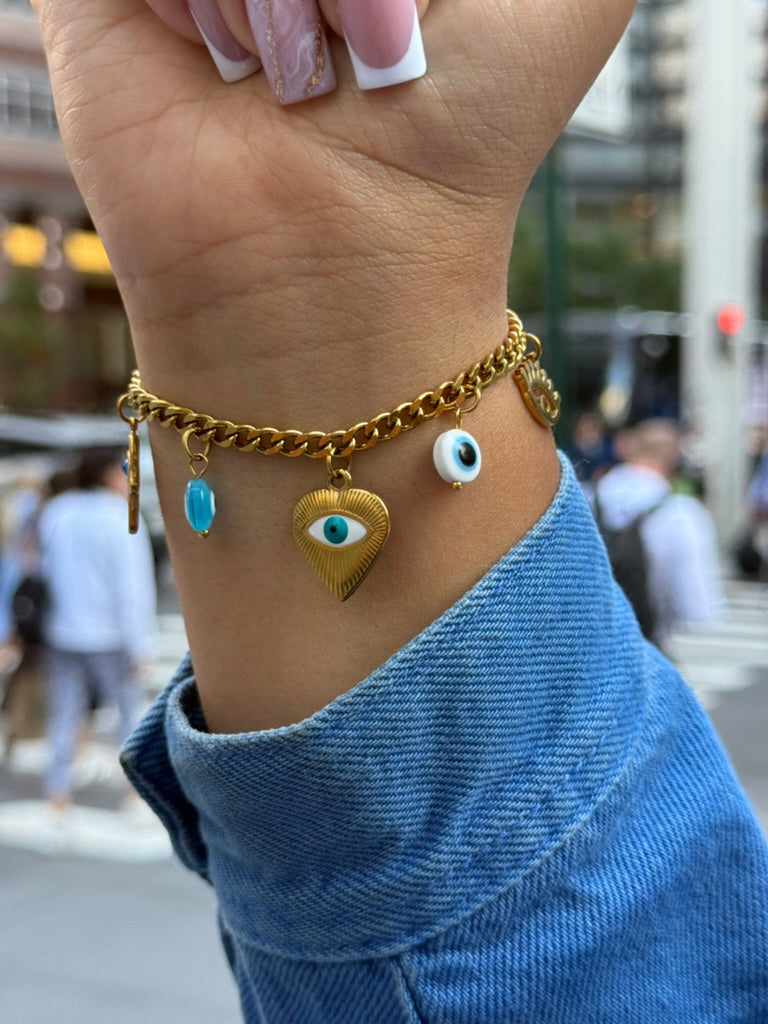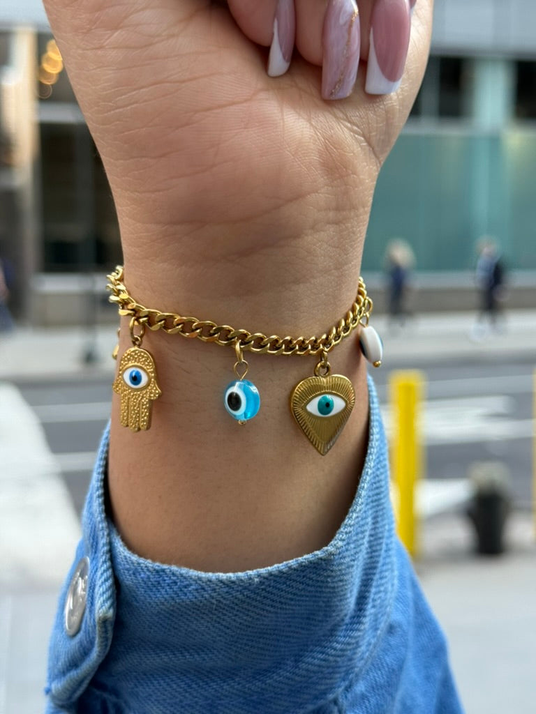 Charm-link bracelet with a clean mix of eye, hamsa, heart, and gaze motifs.
