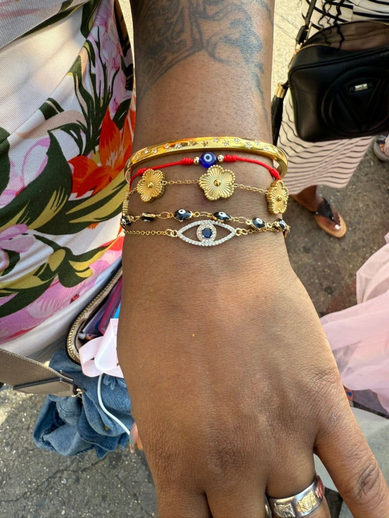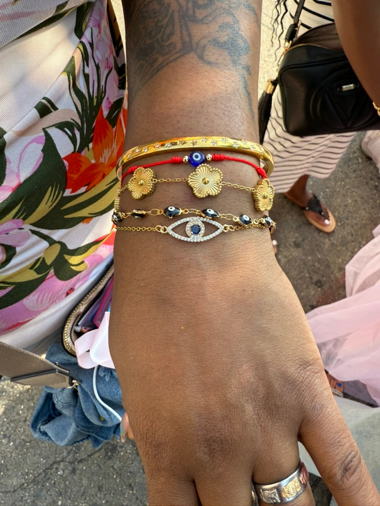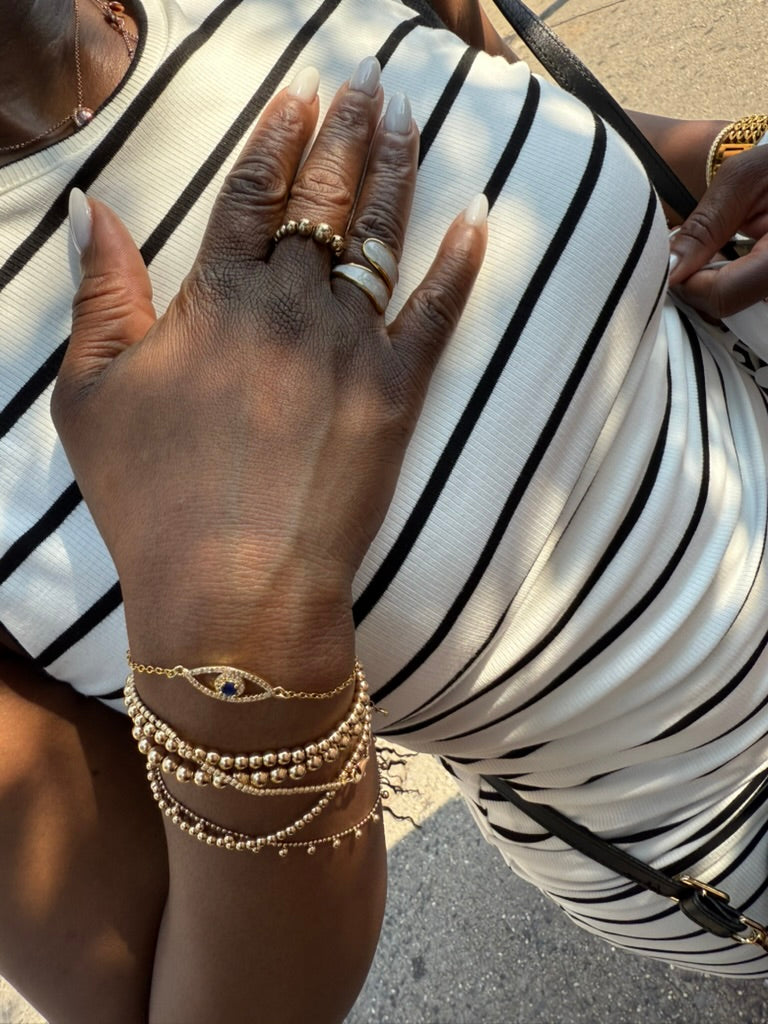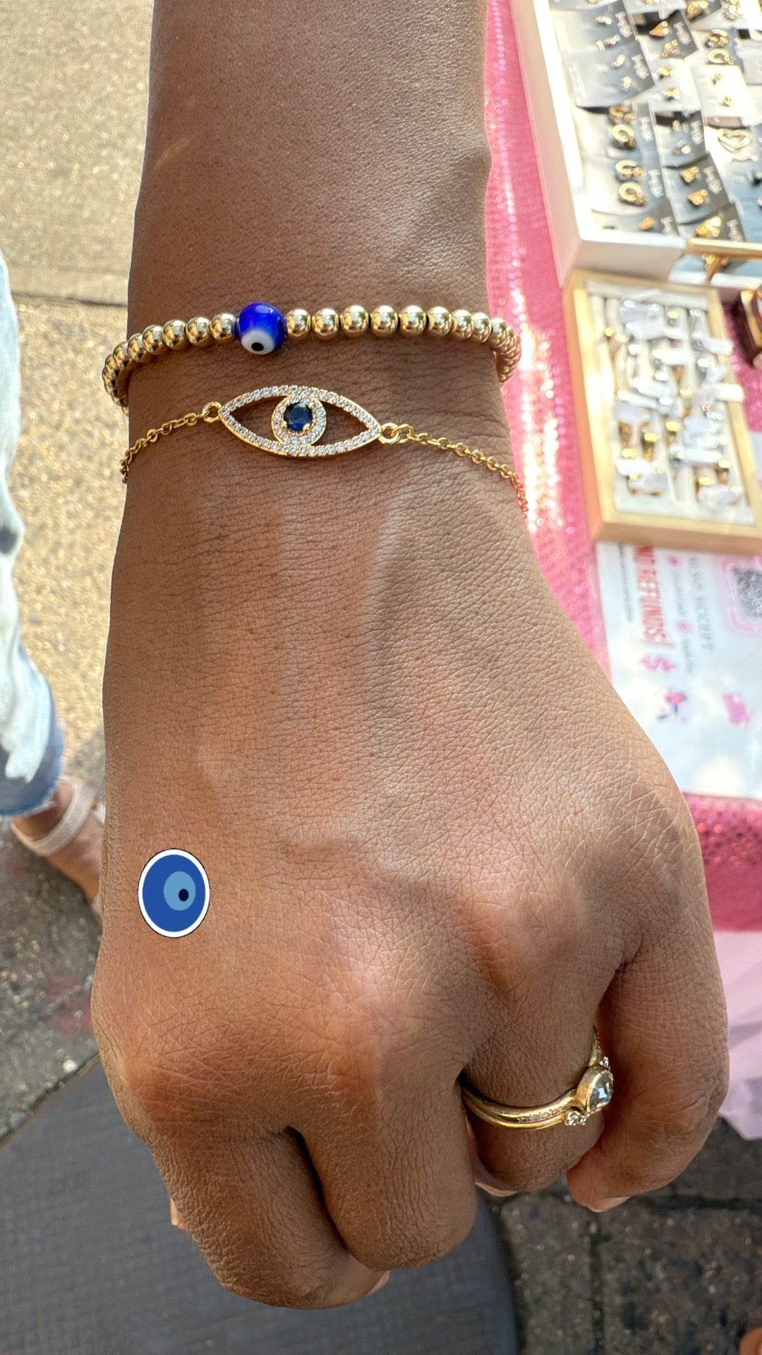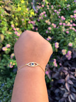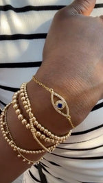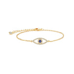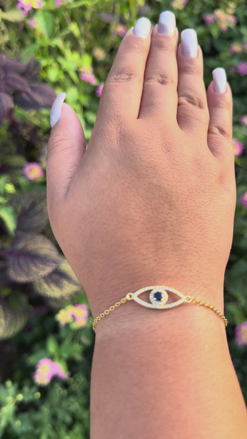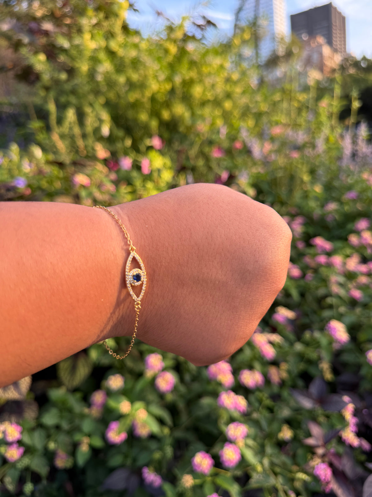 A minimalist bracelet featuring a crisp eye motif framed with clear cubic zirconia and a sapphire-blue center. Built on stainless steel with durable 18K gold plating, it’s made for daily wear—waterproof, hypoallergenic, and tarnish-resistant. The adjustable lobster clasp gives a comfortable, custom fit, and a tiny marquise tail charm finishes the look.