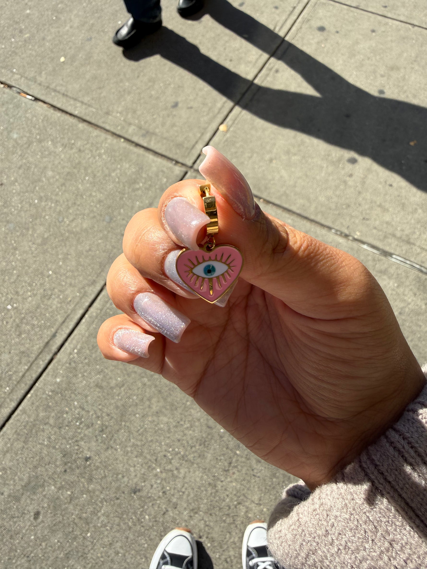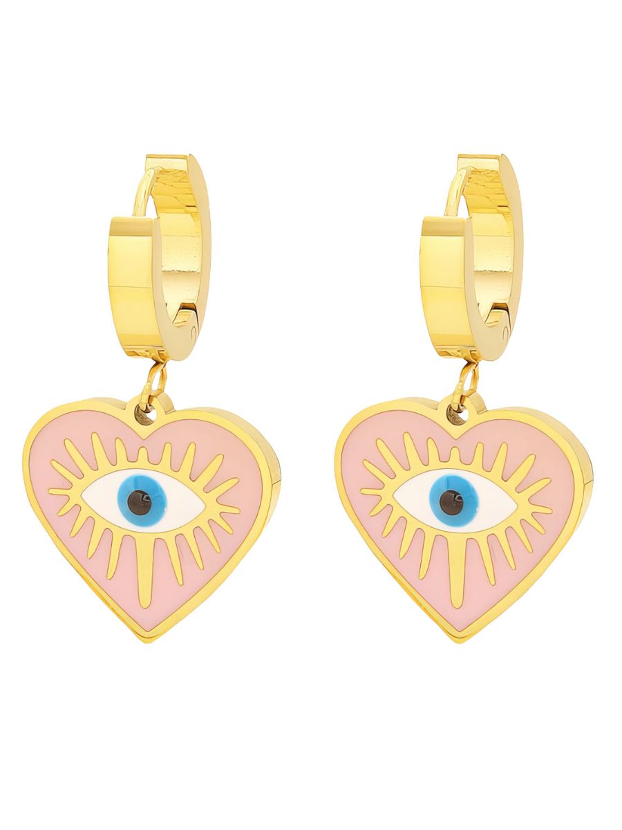 Pink enamel hearts. Blue-eye detail. Clean gold shine. Zero superstition—just style.
