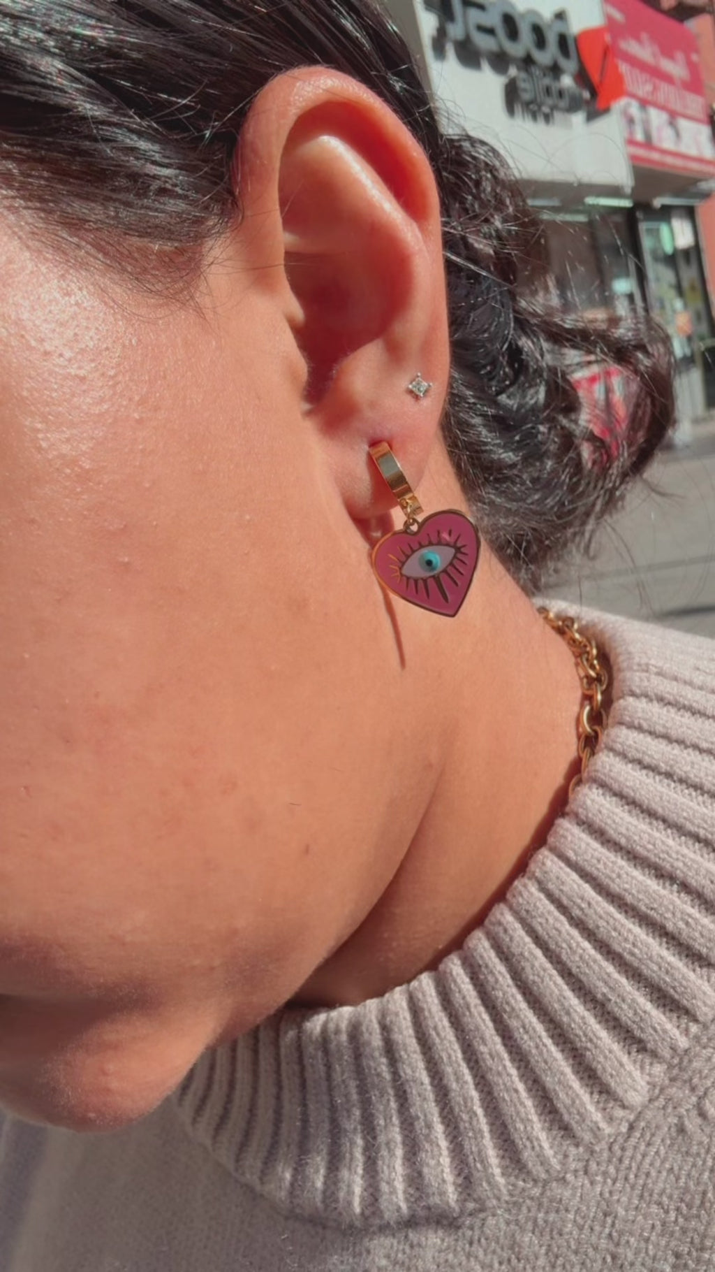 Chunky huggie hoops with a glossy pink heart charm and eye motif. Gold-plated stainless steel + enamel means they’re waterproof, hypoallergenic, and built to stay bright. Light swing, everyday wear.