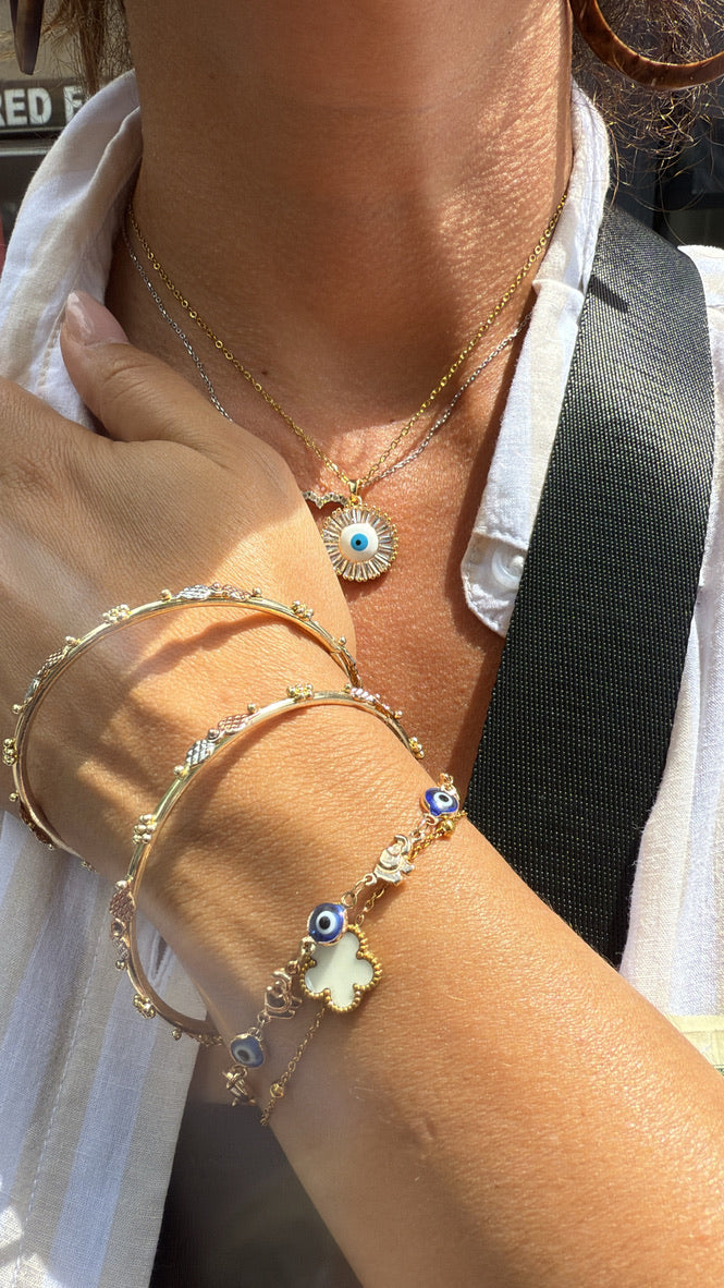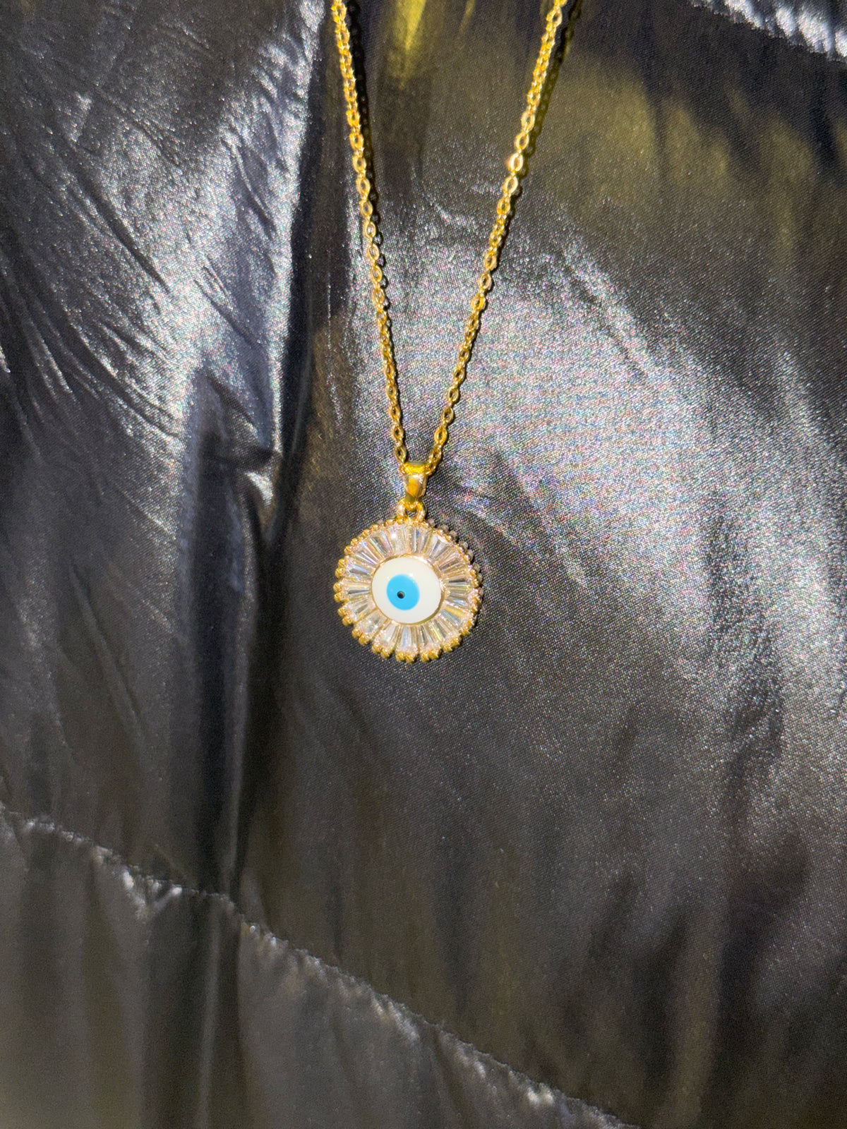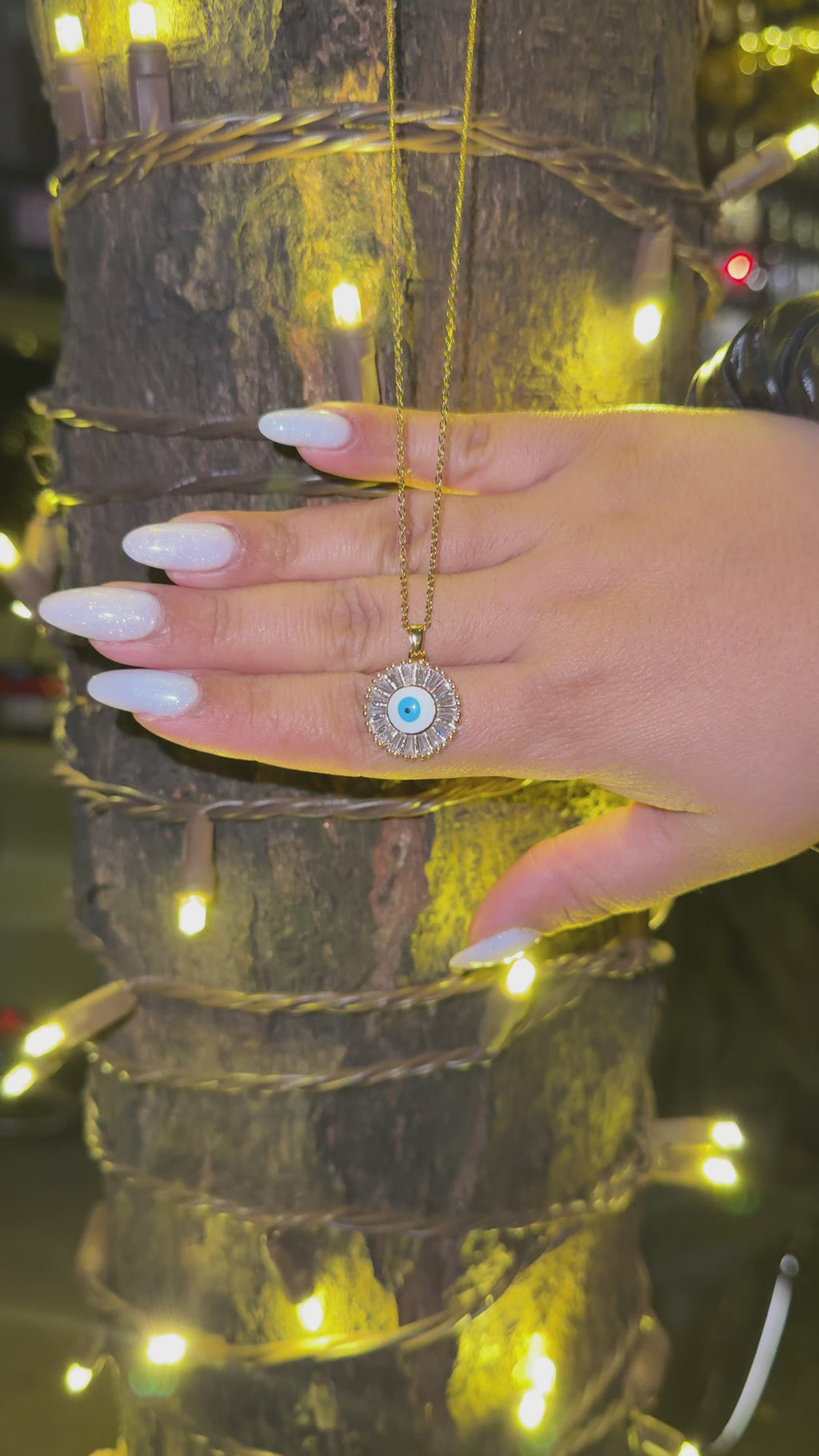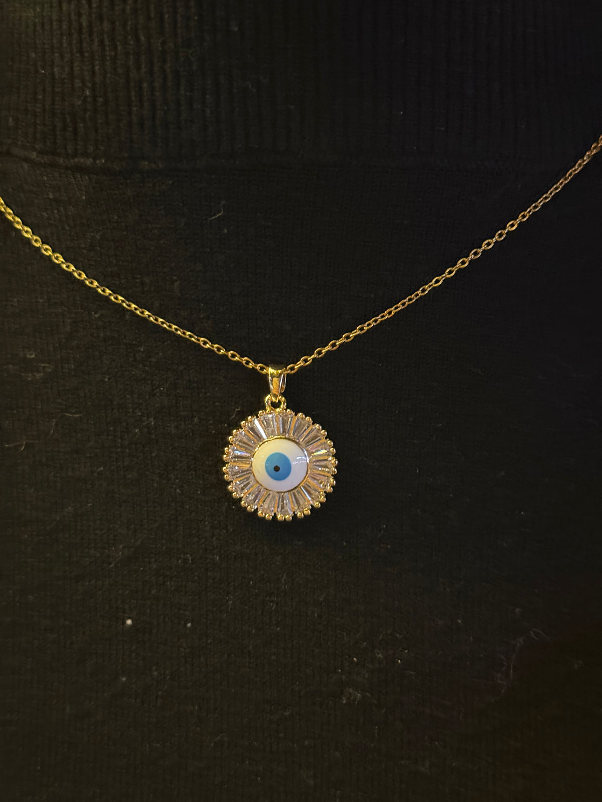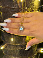 The Gaze Eye Necklace captures protection and brilliance in one timeless piece. Centered with a striking turquoise evil eye surrounded by radiant cubic zirconia rays, it’s designed to reflect light—and ward off negative energy—wherever you go. A statement of clarity, strength, and everyday shine.