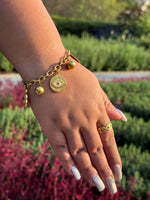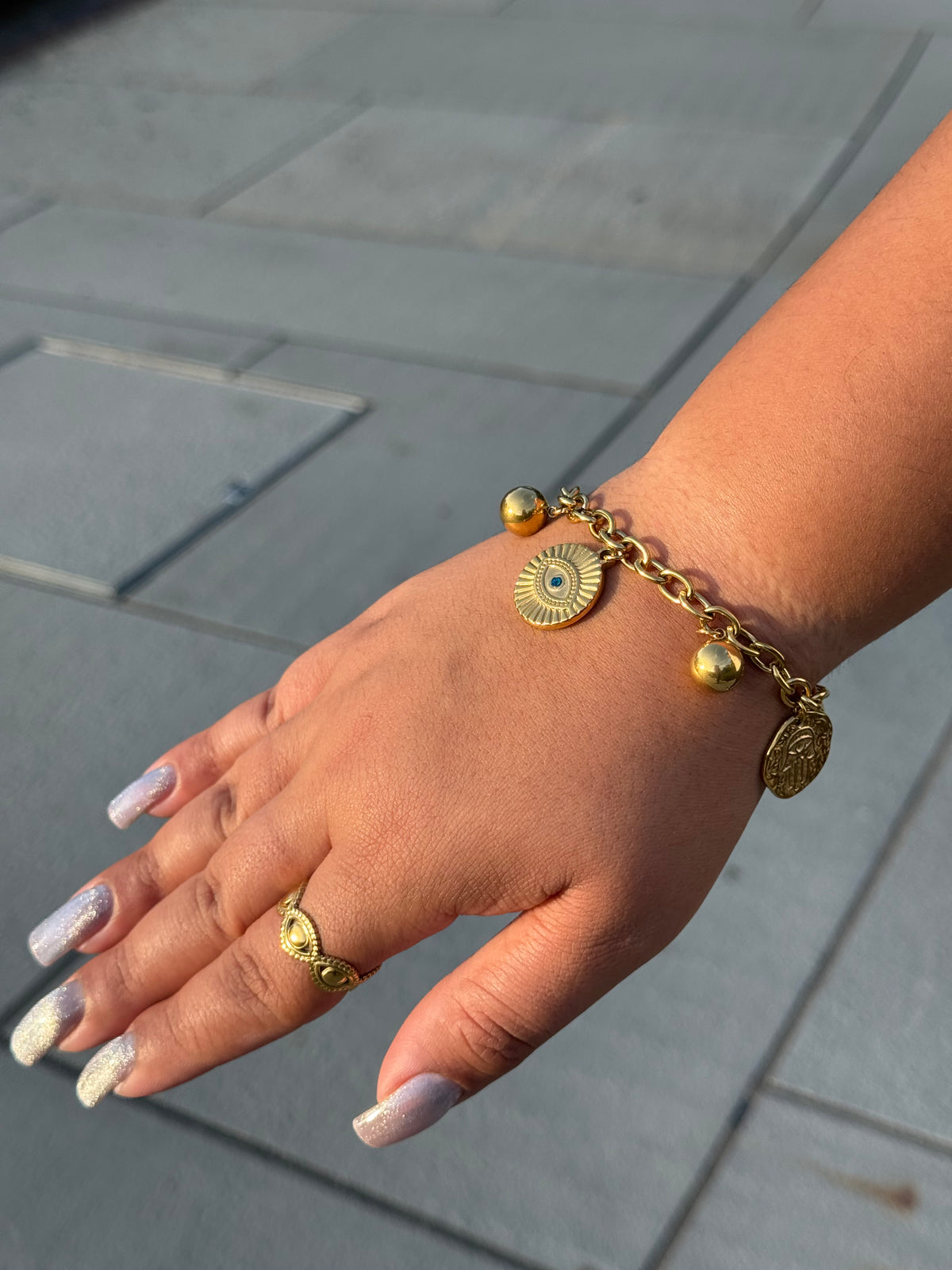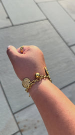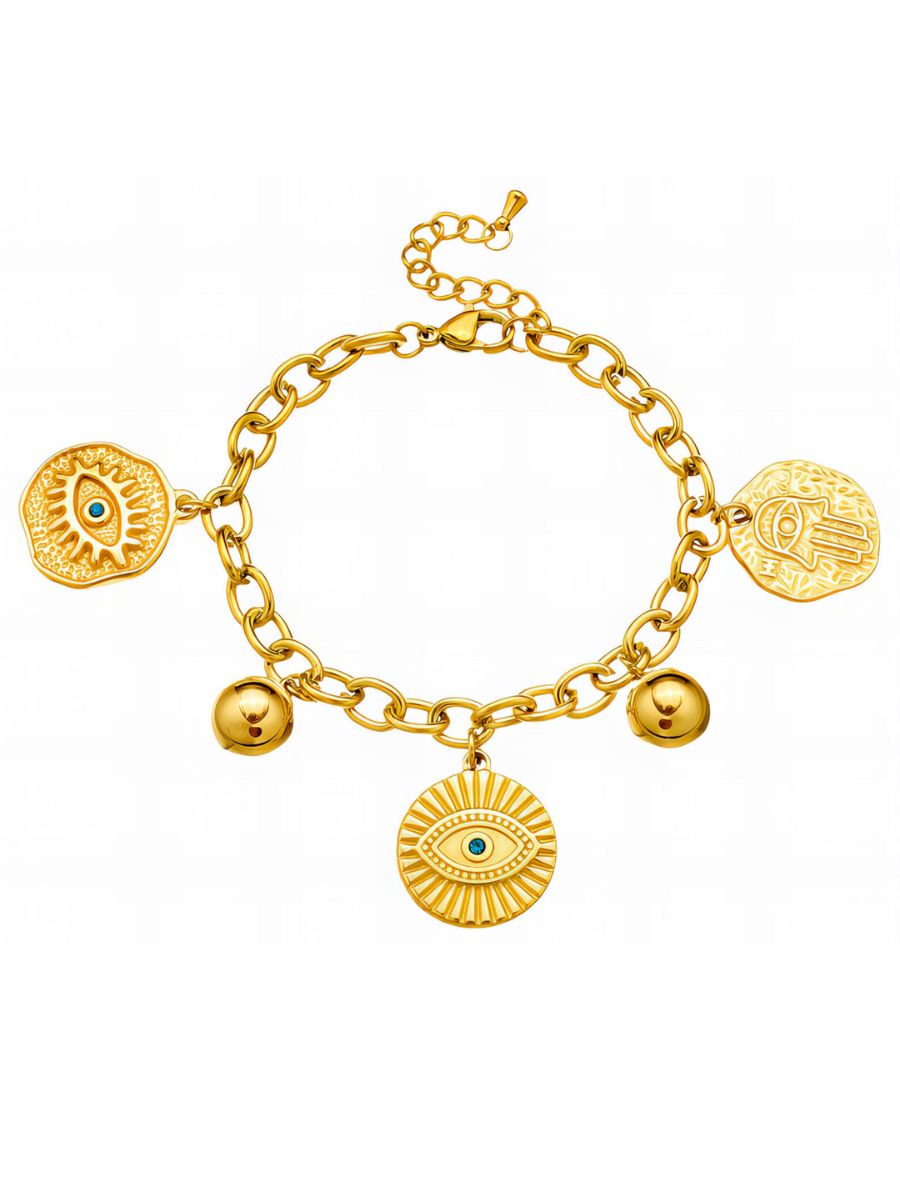 Gold-plated charm bracelet with eye and hamsa motifs. Waterproof