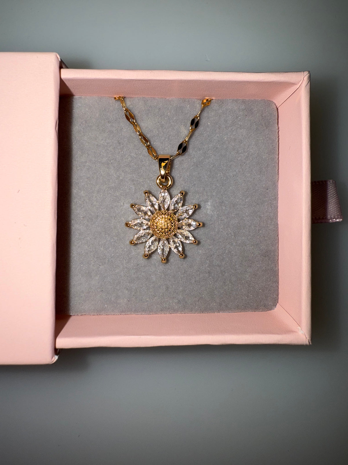 The Sunflower Daisy Necklace brings a touch of warmth and light to every outfit. Designed with dazzling cubic zirconia petals and a textured gold center, this piece captures the beauty of a sunflower in full bloom — symbolizing positivity, growth, and joy. Perfect for everyday wear or layered with other Monaluck favorites.