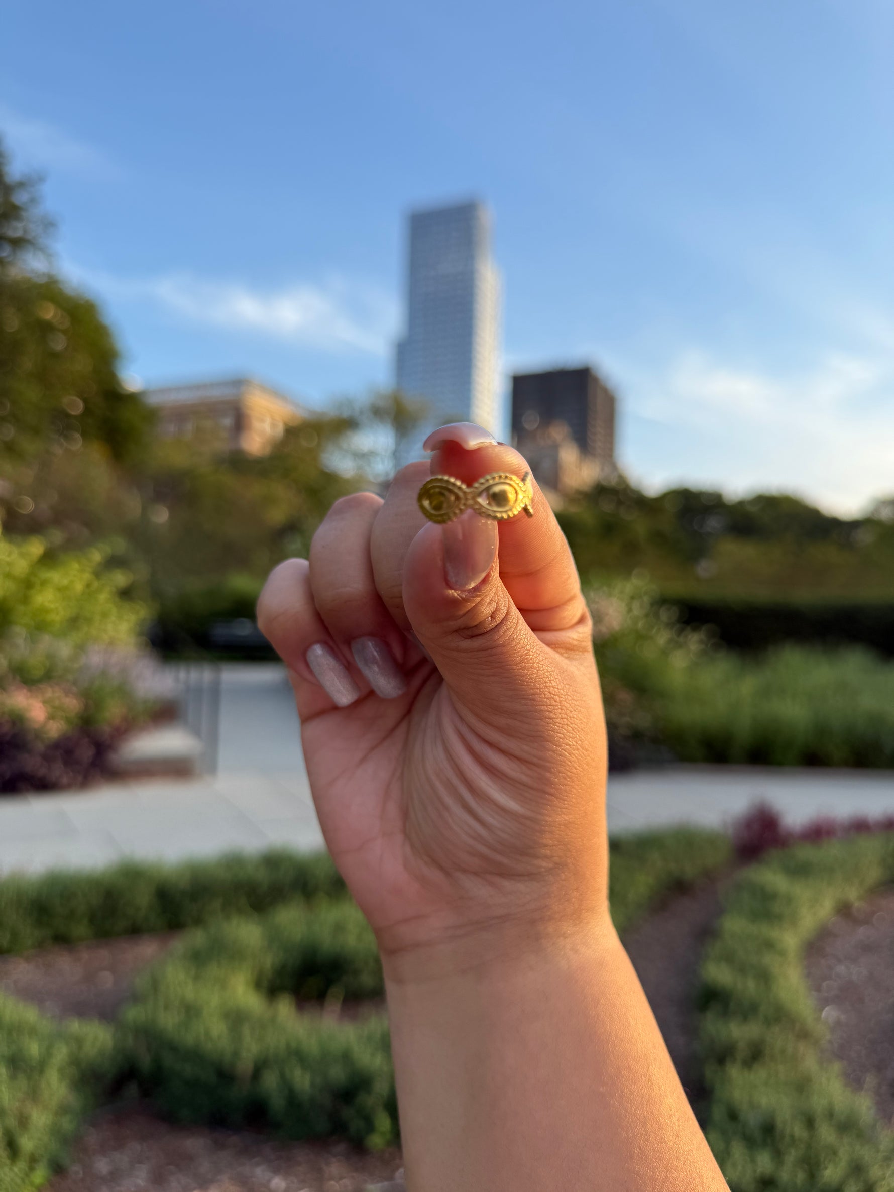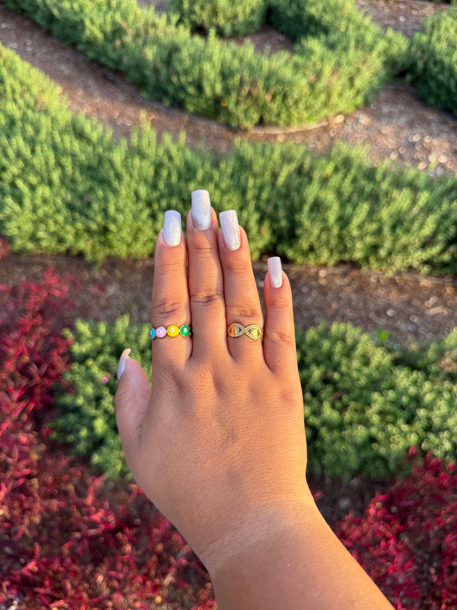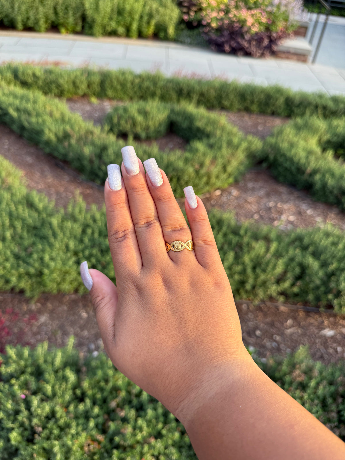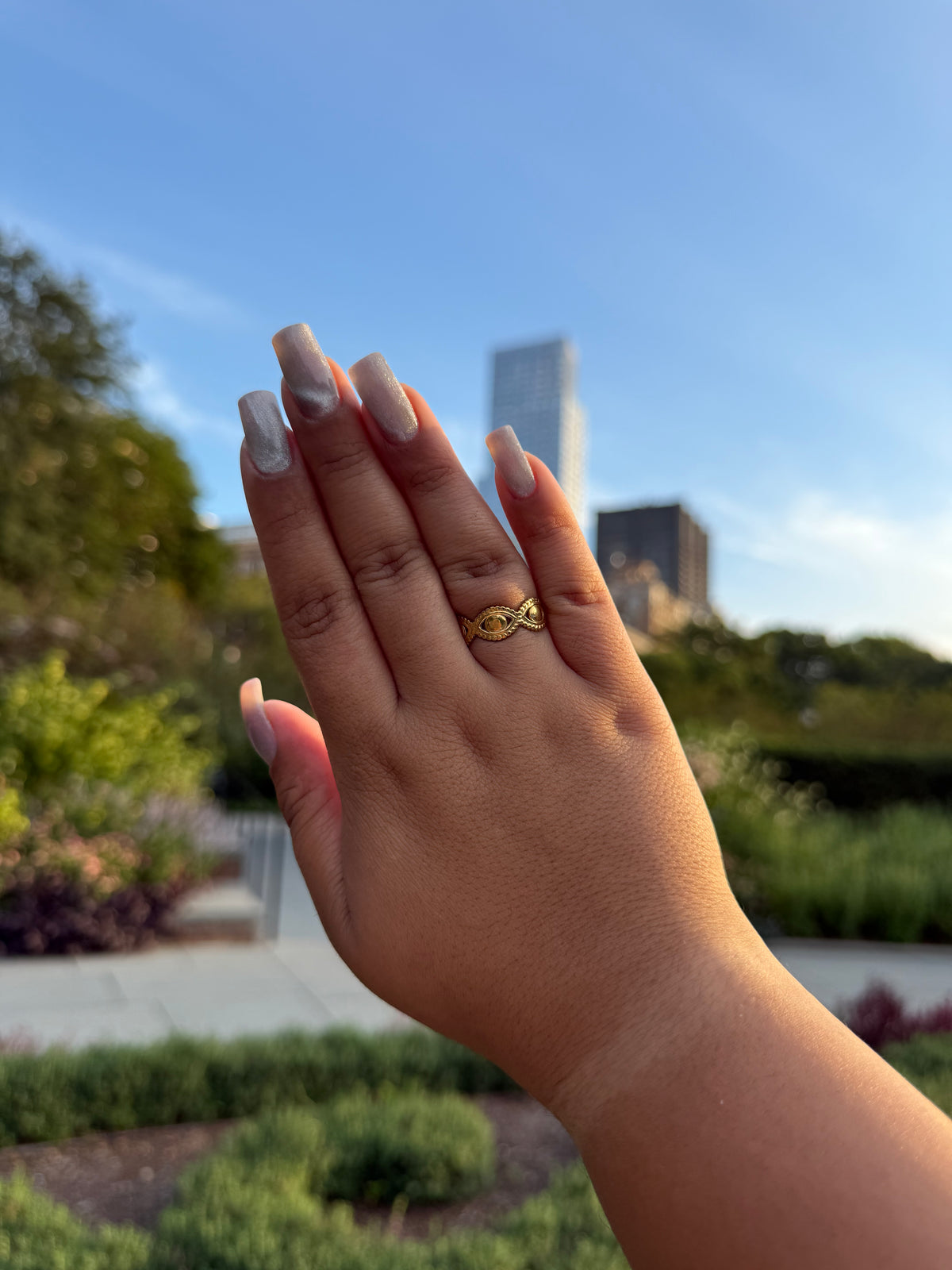 An everyday eye-motif ring with a glossy gold-plated finish. Built on stainless steel so it’s waterproof, hypoallergenic, and made to resist tarnish. Lightweight, stackable, and adjustable for a no-stress fit—dress it up or keep it minimal.