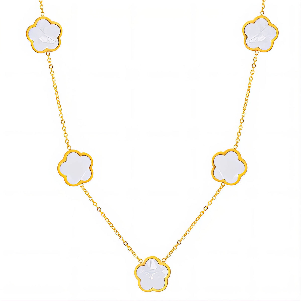 The Petal Five Necklace brings a soft, balanced look with five delicate floral charms evenly spaced along a slim gold-tone chain. Minimal yet expressive, it’s designed to sit beautifully on the neckline—perfect worn solo for a subtle statement or layered for an elevated everyday look.