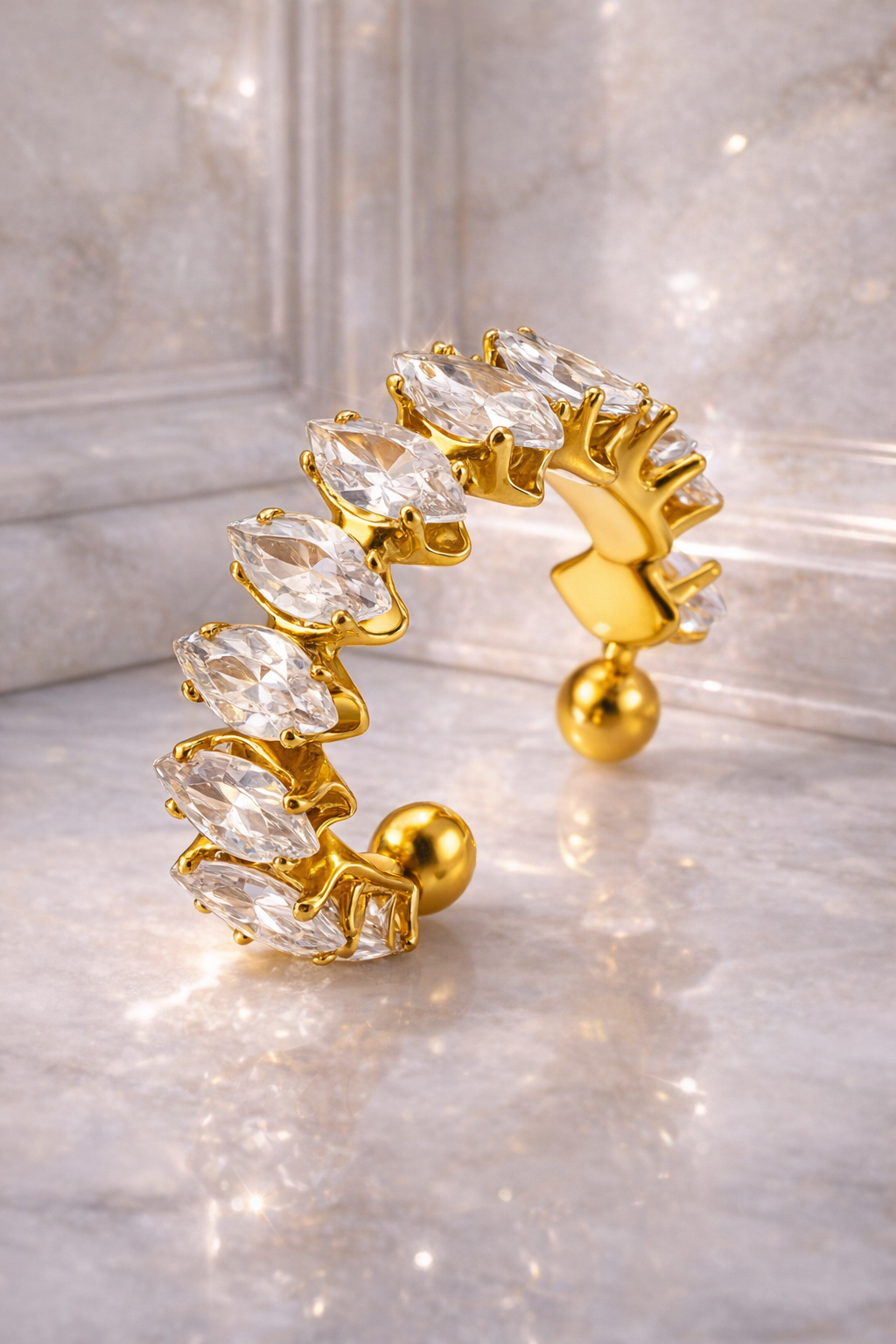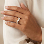 The Princess Crown Ring features a striking row of marquise-cut cubic zirconia stones arranged in a graceful crown-like curve across the finger. Each stone reflects light beautifully, creating a bright and eye-catching look that adds elegance to any outfit. The unique shape gives the ring a refined statement style while still feeling modern and wearable.