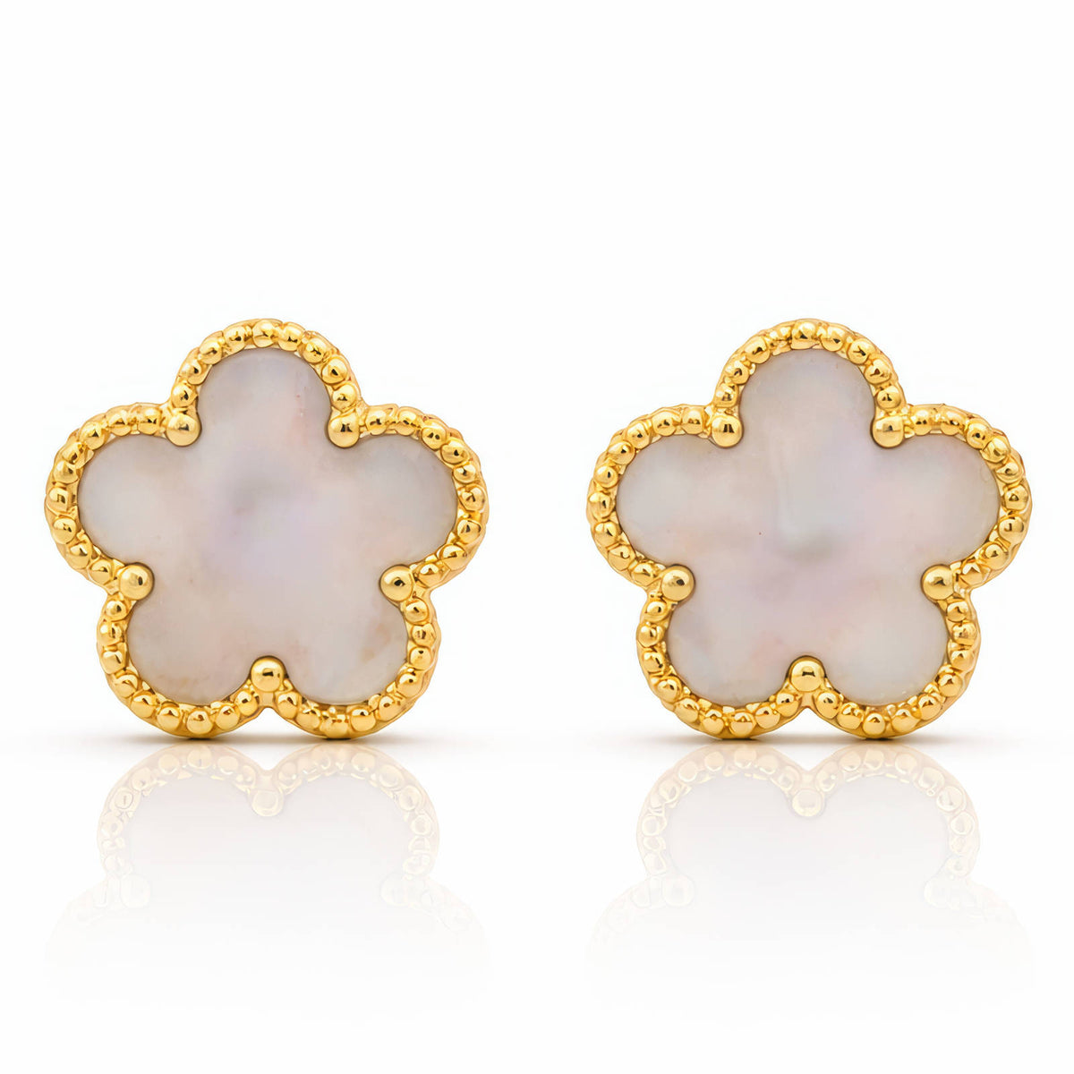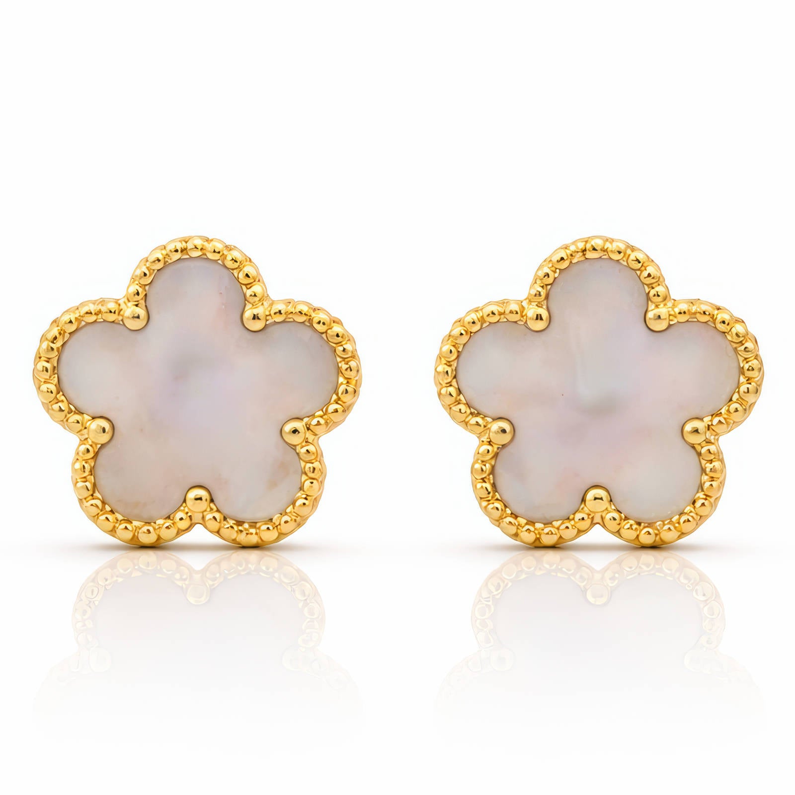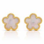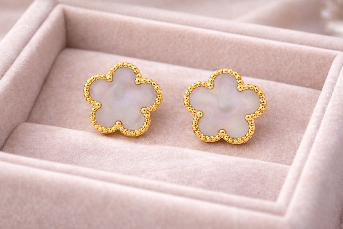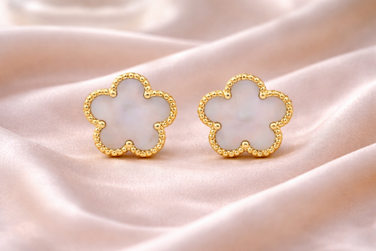 The Florette Pearl Glow Earrings feature a delicate flower silhouette filled with a luminous pearl-toned center, framed by polished gold beaded edges. The soft glow of the center stone reflects light beautifully, creating a clean and graceful look that feels timeless yet modern.