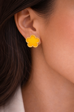 The Florette Sunbeam Earrings feature a bold floral silhouette filled with a vibrant golden-yellow tone, framed by polished gold beaded edges. The bright color brings a lively and uplifting feel, while the delicate gold border highlights the soft flower shape with refined detail.