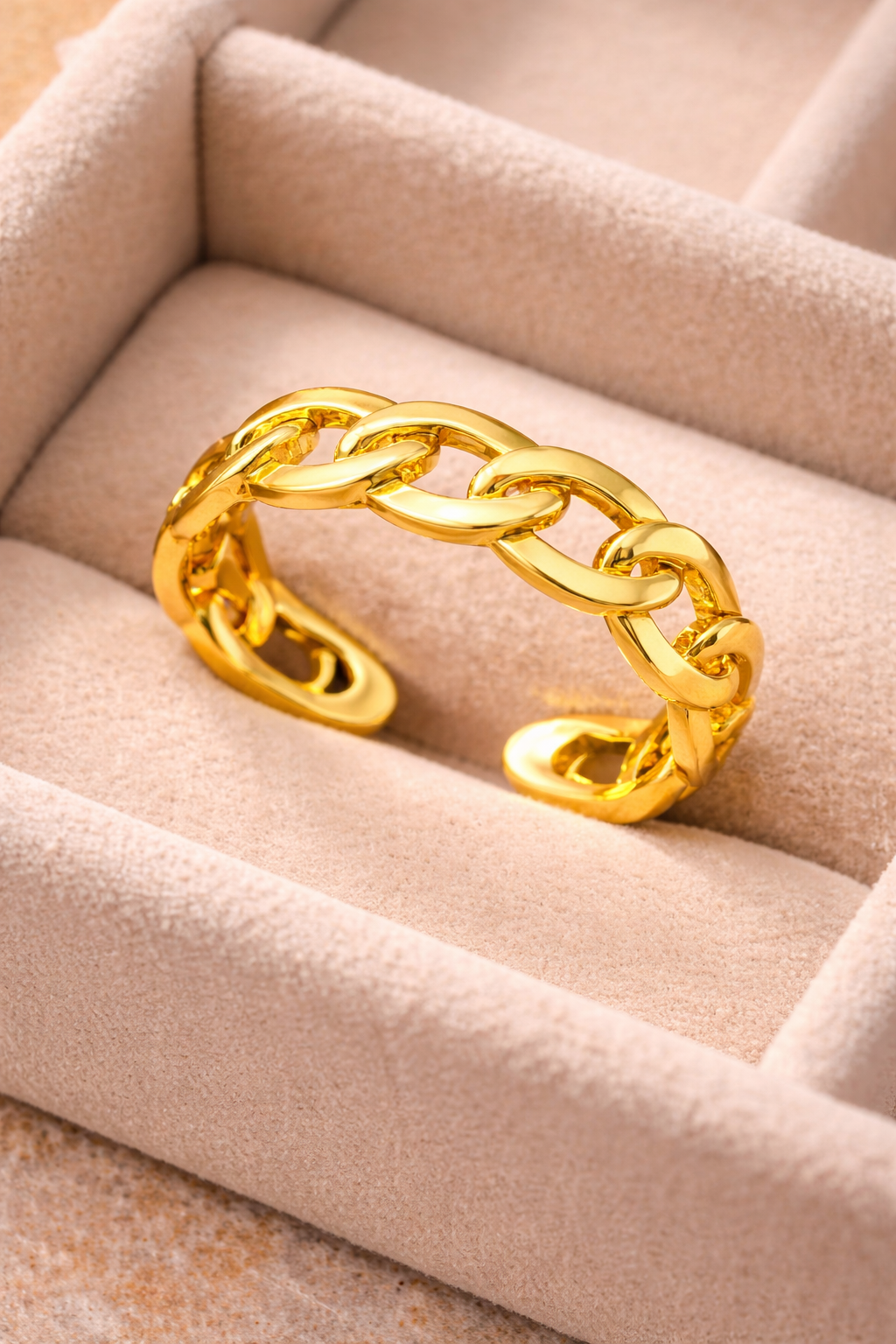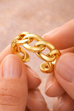 Its open adjustable structure allows the ring to comfortably fit different finger sizes while maintaining the clean chain silhouette. Lightweight and stylish, it can be worn alone as a statement piece or stacked with other rings for a layered look.