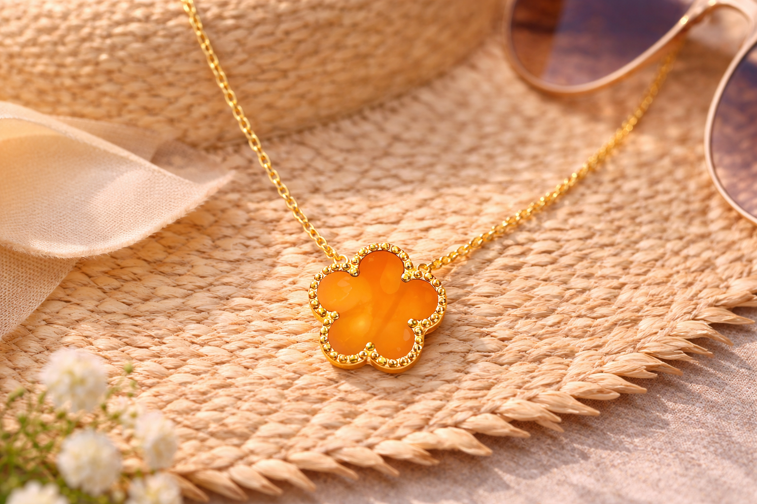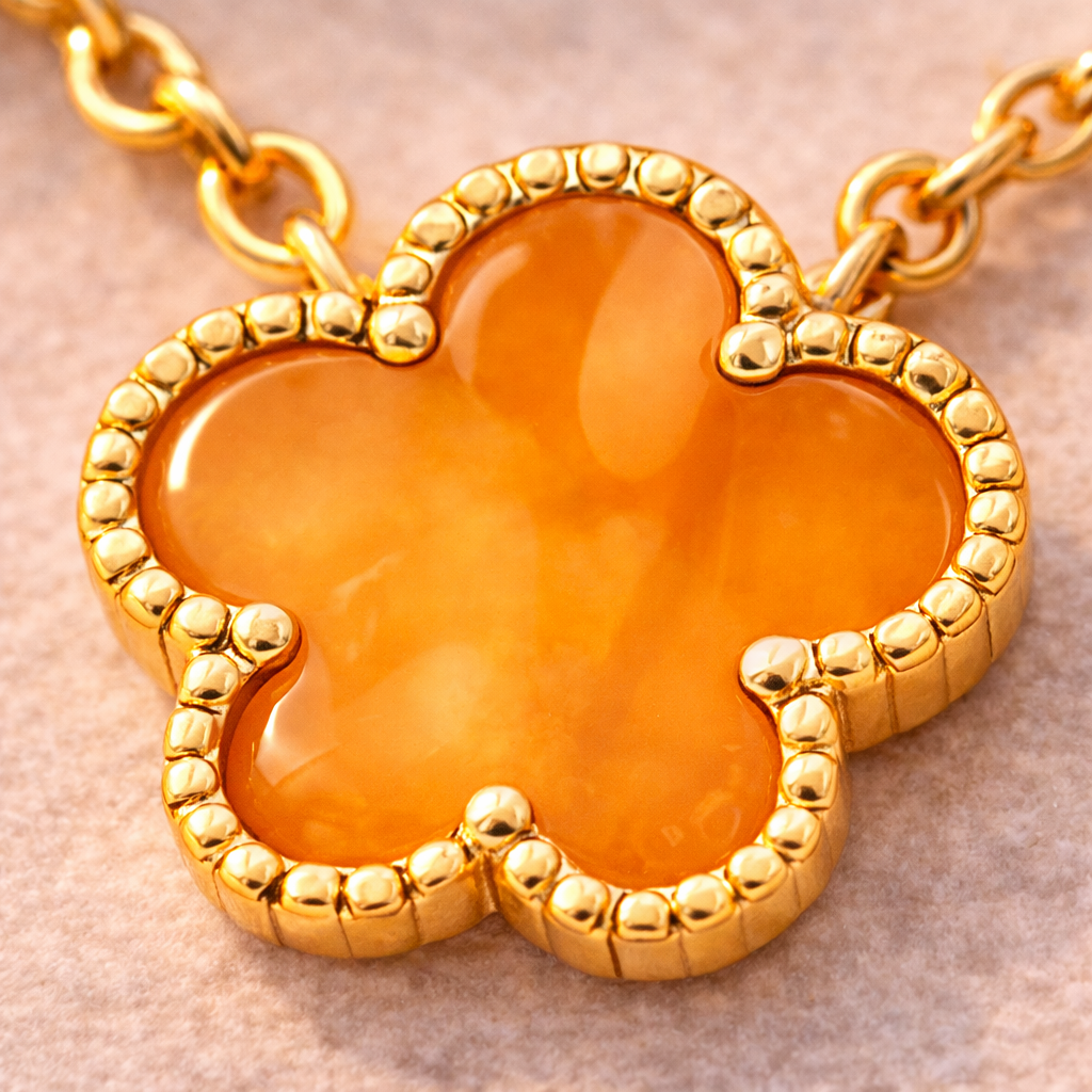 Designed with a slightly longer chain, the pendant rests naturally along the neckline, making it perfect for layering with other necklaces or wearing on its own as a subtle statement piece. The floral silhouette keeps the design soft and feminine while the honey tone adds warmth and vibrancy.