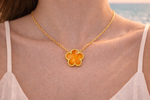 The Florette Honey Necklace features a single floral pendant filled with a rich honey-amber tone, framed by delicate gold beaded edges. The warm color creates a soft glow that pairs beautifully with the polished gold chain, giving the piece a bright and elegant look.