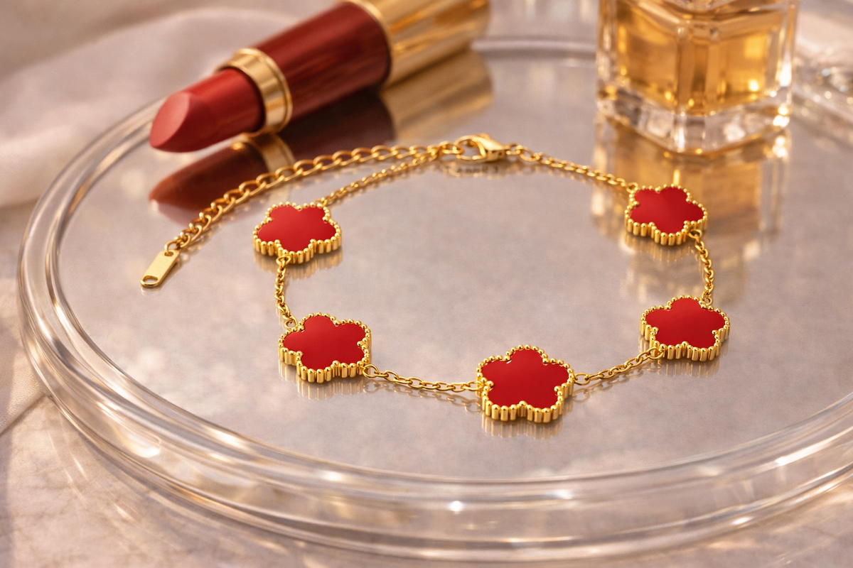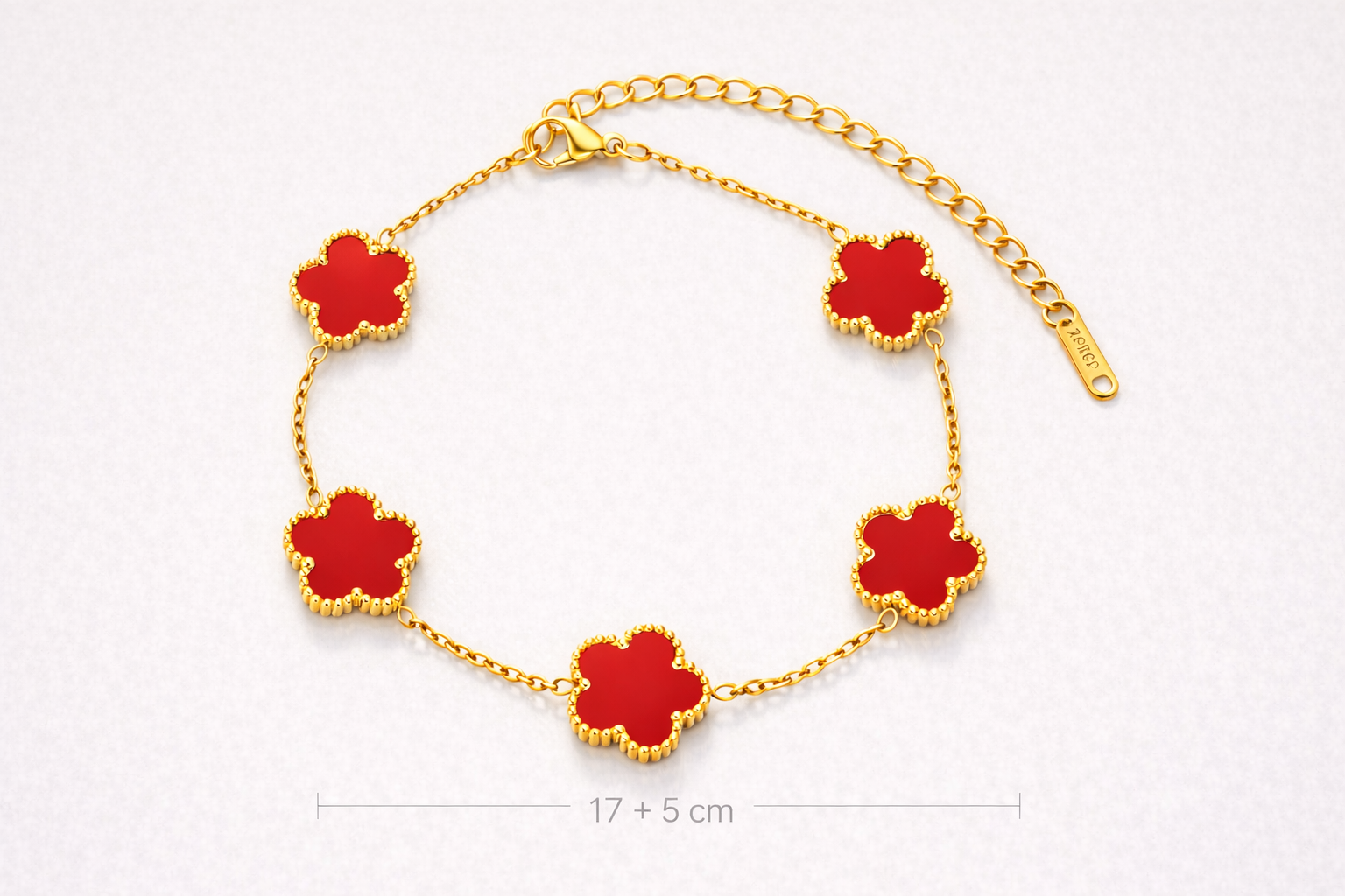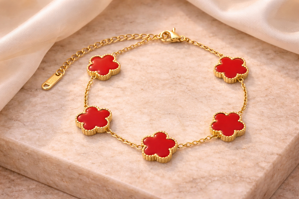 The Florette Ruby Bracelet features five flower-shaped charms framed in polished gold, each finished with a vibrant ruby-toned flower inlay. The rich red contrast against the gold base creates a confident, eye-catching look that instantly elevates your style.