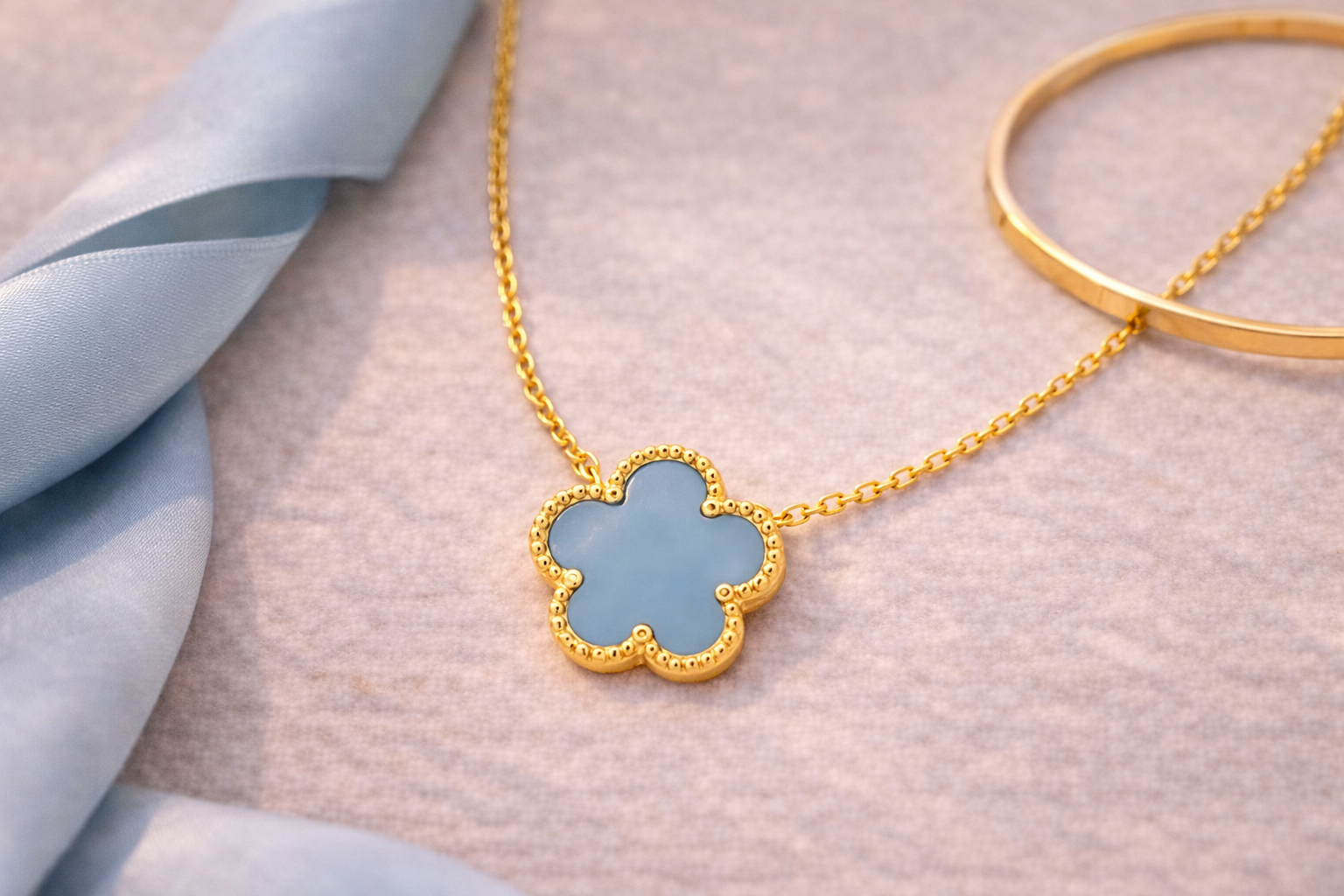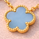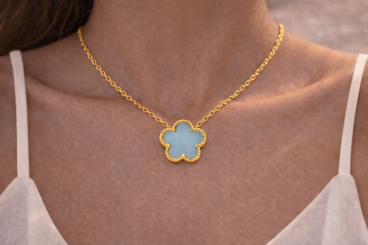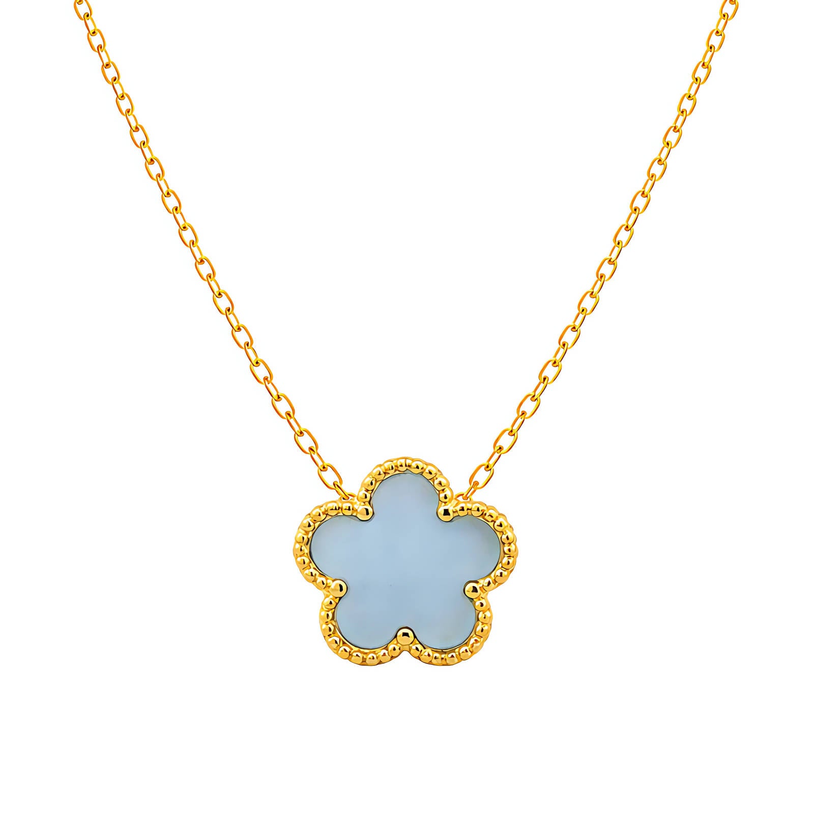The Florette Single Sky Necklace features a delicate flower pendant filled with a calm sky-blue tone, framed by polished gold beaded edges. The gentle blue color creates a fresh and airy feel, while the clean floral shape keeps the design simple, elegant, and timeless.